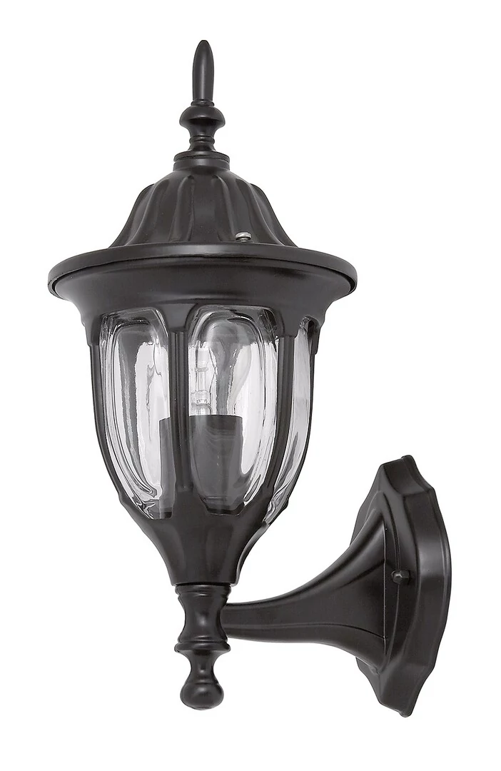- Klasszikus megjelenésű kültéri falikar 1 db foglalattal. 20,5 cm kinyúlású, 37 cm magas, fekete színű, fémből készített lámpatest és üvegbúra, IP43-as védettséggel. A lámpatest E27-es foglalatú, max. 60W teljesítményű fényforrással használható.